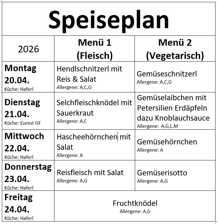 Der aktuell gültige Speiseplan:Woche vom 20.4. – 24.4.2026 Angaben ohne Gewähr. Abweichungen möglich.